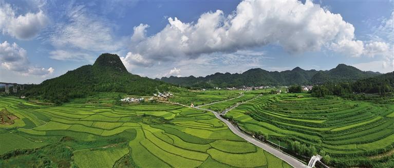 夏末,花垣縣麻栗場鎮沙科村水稻長勢喜人。相傳清朝舉人石板塘來到此地,看見一座“尖巖山”如筆直插云霄,便出了“尖山似筆,倒寫藍天一張紙”的上聯,引來眾多文人墨客應對下聯。此地也因“尖山”而聞名。 團結報全媒體記者 張謹 攝