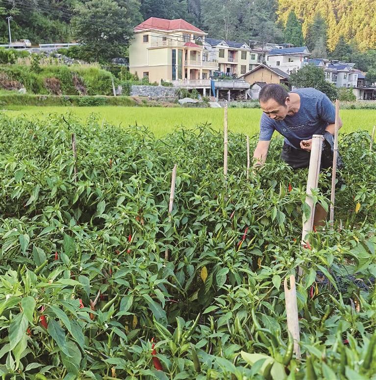 8月20日,吉首市石家沖街道勤豐村,村民正在收獲朝天椒。今年,在吉首晟興農業公司培管技術和訂單收購支持下,該村種植辣椒60余畝,畝產約1500公斤,可帶動村民每畝增收約8000元。 團結報全媒體記者 李再興 攝