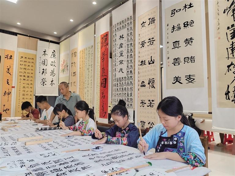 暑假以來,吉首市石家沖街道組織轄區農民書法家在該街道新時代文明實踐所免費教習書法。圖為8月22日,寨陽村農民書法家楊再喜老師指導學生練習書法。 覃雨田 向軍 攝