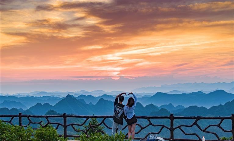 8月27日清晨,永順縣土司大營度假區,陽光刺破黑暗,逐漸照亮群山,“萬馬歸朝”的景觀令人震撼。一對戀人站在觀景臺上,幸福迎接日出。 團結報全媒體記者 張謹 攝