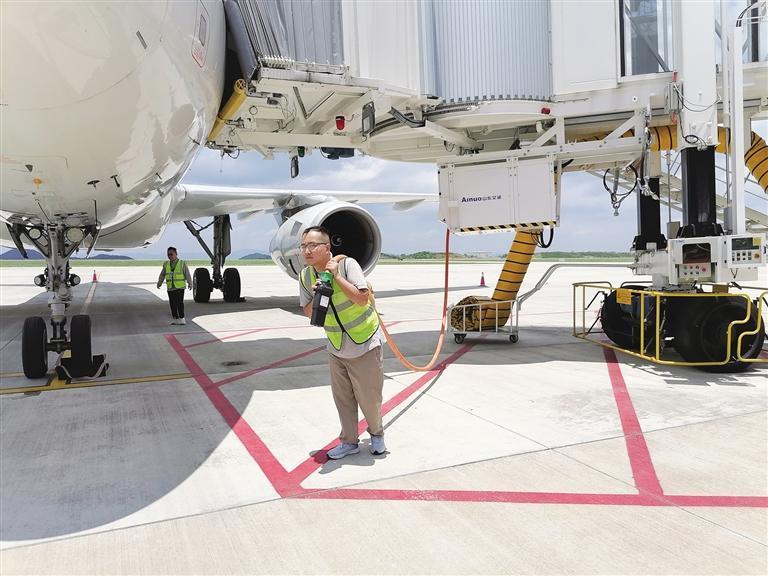 8月20日, 湘西邊城機(jī)場(chǎng),橋載操作員每天需背負(fù)20斤重的電纜,對(duì)進(jìn)港航班進(jìn)行保障服務(wù)。 彭弘 鄒帆 攝