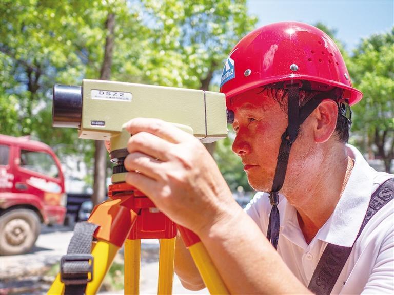 7月22日,大暑,瀘溪縣武溪鎮(zhèn)沅江社區(qū)紅星小區(qū),工程技術(shù)人員冒高溫開展老舊小區(qū)改造配套基礎(chǔ)設(shè)施建設(shè)測(cè)量工作。 張克寧 攝