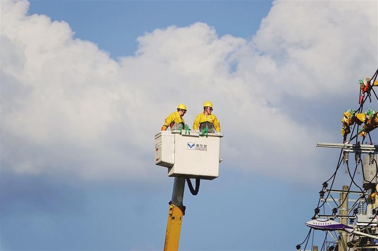 7月23日,龍山縣城朝陽(yáng)路,國(guó)網(wǎng)龍山縣供電公司帶電作業(yè)人員頂著39℃以上的高溫,帶電處理10千伏寶朝線開關(guān)缺陷,確保電網(wǎng)安全穩(wěn)定運(yùn)行。 田良東 攝
