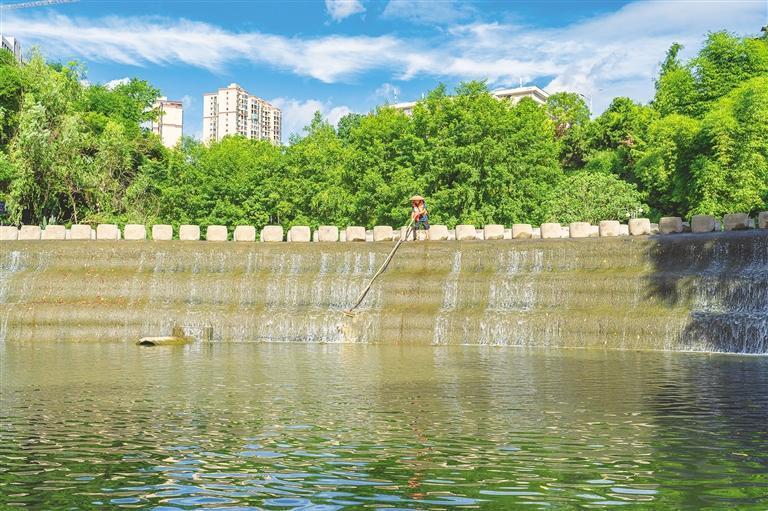 7月19日,湘西高新區(qū)灣溪河,環(huán)衛(wèi)工人冒著酷暑高溫,在水壩清除淤積的雜物垃圾。 梁永鴻 攝