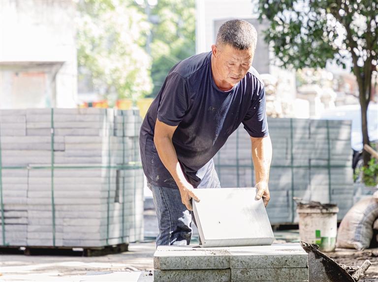 8月6日,瀘溪縣武溪鎮(zhèn)白沙社區(qū)株洲南路,施工人員揮汗如雨在鋪修人行道路。 覃仁崗 攝