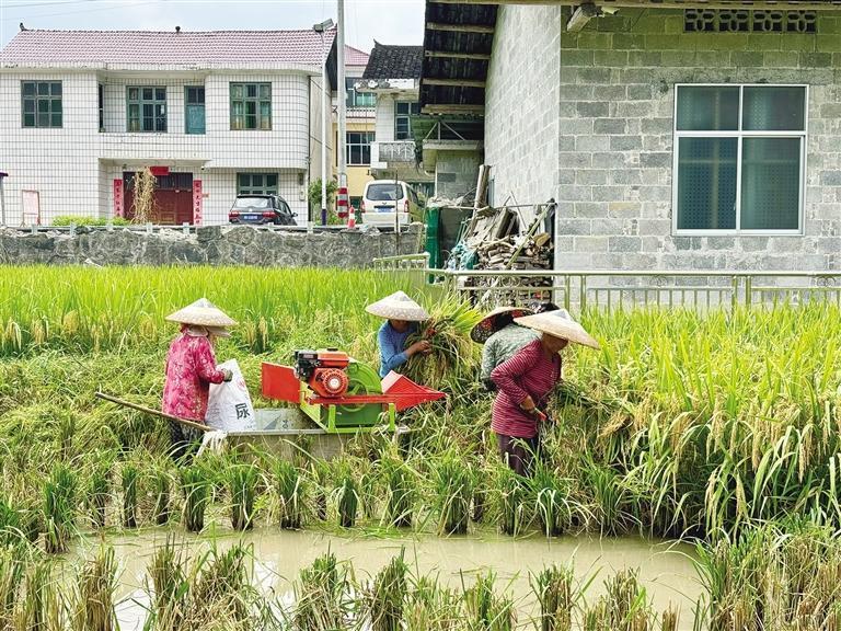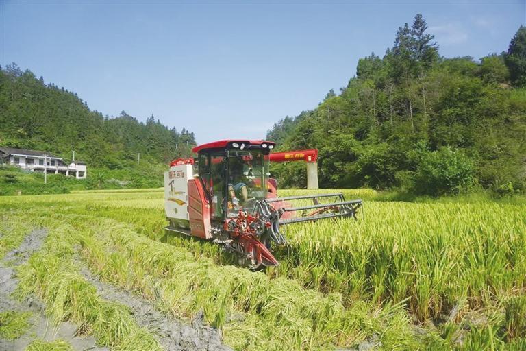 近日,吉首市矮寨鎮排兄村,村民們搶抓晴好天氣,利用農機具抓緊收割稻谷,確保糧食顆粒歸倉。 梁永鴻 攝
