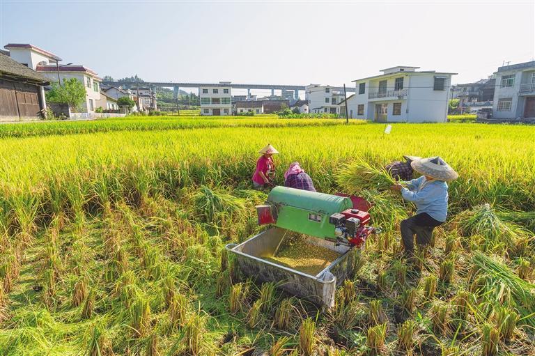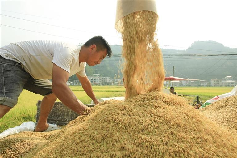 9月3日,龍山縣召市鎮大興村,農民在田間收獲稻谷,確保顆粒歸倉。田禮成 攝