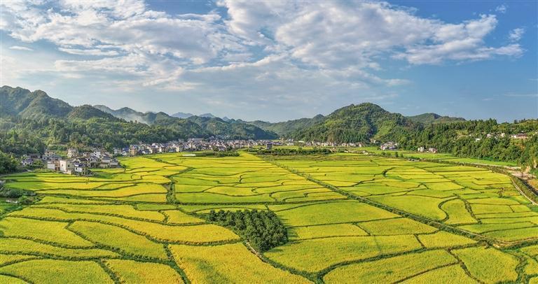 9月10日,保靖縣復興鎮甘溪村的村集體經濟水稻產業進入收獲期,金燦燦的稻田呈現出一派豐收的景象。甘溪村打造千畝稻油輪作基地,助推村集體經濟發展,2023年,村集體經濟收入160余萬元。 團結報全媒體記者 朱開朗 攝