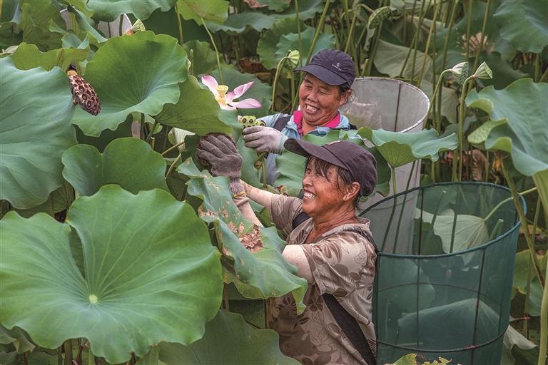 近日,瀘溪縣浦市鎮萬荷園里,蘭祺合作社工人正在采收蓮子。該合作社2022年承包萬荷園中心景區450 畝荷塘,開展荷花種植,每年采收蓮子6萬多公斤,年均產值百余萬元,助力群眾增收致富。 張克寧 攝
