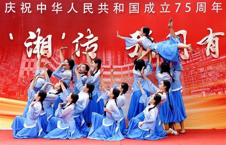 9月29日,吉首市雅溪小學學生在表演舞蹈《寸心寄華夏 五四漾年華》。當天,該市關工委聯合市教體局開展“薪火‘湘’傳,強國有我”慶祝新中國成立75周年活動,以一系列豐富多彩的形式表達學生們對祖國的熱愛。 姚方 楊燕萍 攝
