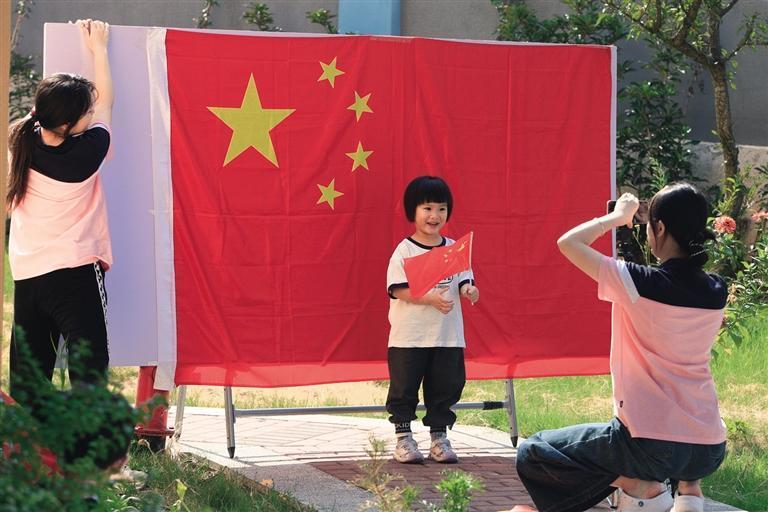 9月27日,龍山縣第一幼兒園,老師在國旗前為小朋友拍照留影,表達對祖國母親的熱愛和祝福,迎接國慶節的到來。 曾祥輝 常捷 攝