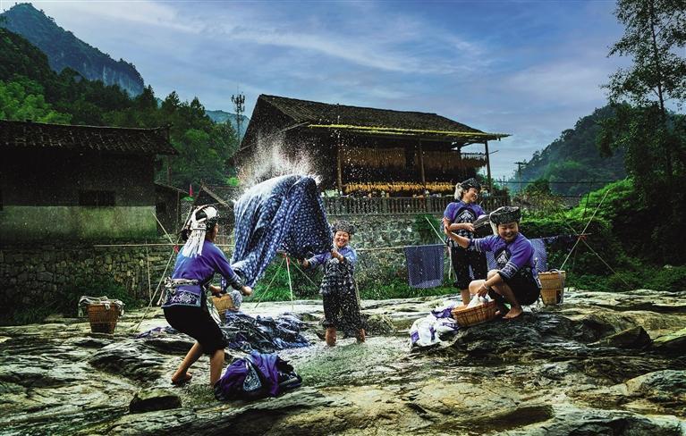 吉首市矮寨鎮坪年村是苗族集聚村,是第四批中國傳統村落、少數民族特色村寨,村里保留有濃厚的苗族傳統文化。圖為村中身著苗族傳統服飾的姑娘在溪中漿洗。 陳生愛 攝