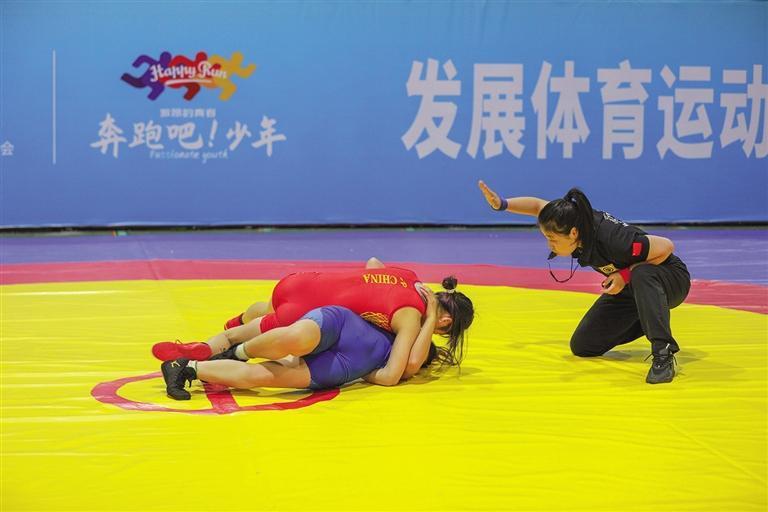 10月21日,湘西州體育中心摔跤館,女子自由式摔跤比賽現(xiàn)場。
