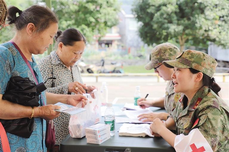 6月17日是吉首市民兵活動(dòng)日,該市人武部組織醫(yī)療救護(hù)連民兵來到幫扶村己略鄉(xiāng)龍舞村,開展上門義診服務(wù)、野戰(zhàn)軍事訓(xùn)練及“征兵宣傳進(jìn)村寨”活動(dòng)。圖為醫(yī)療救護(hù)連民兵為村民義診。 瞿芳 攝