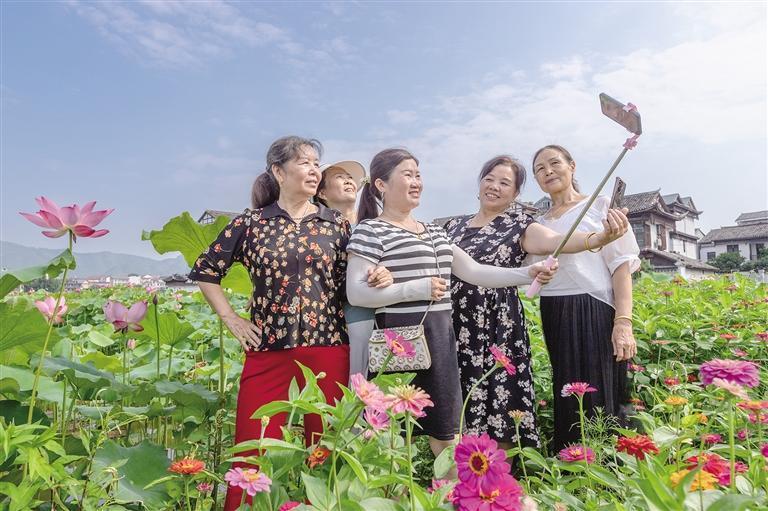 近日,瀘溪縣浦市古鎮萬荷園,朵朵荷花在驕陽下肆意舒展,將古鎮裝點成一幅清新淡雅的水墨畫卷,吸引游客前來打卡拍照。 張克寧 楊劍波 攝