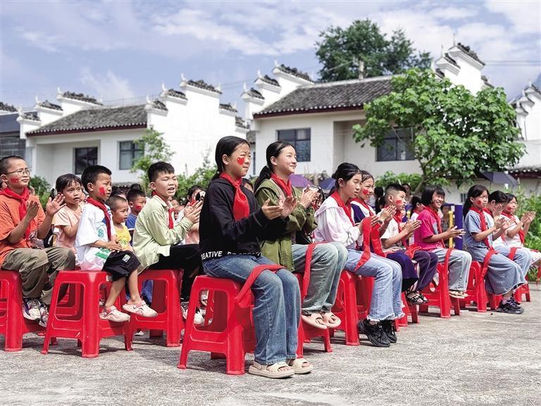 順著鄉間道路,車輛靠近龍山縣里耶鎮大板社區時,童聲笑語愈加悅耳。