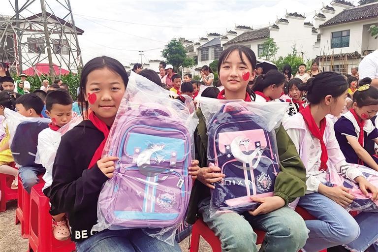 為孩子們發放愛心書包。 團結報全媒體記者 楊賢清 攝