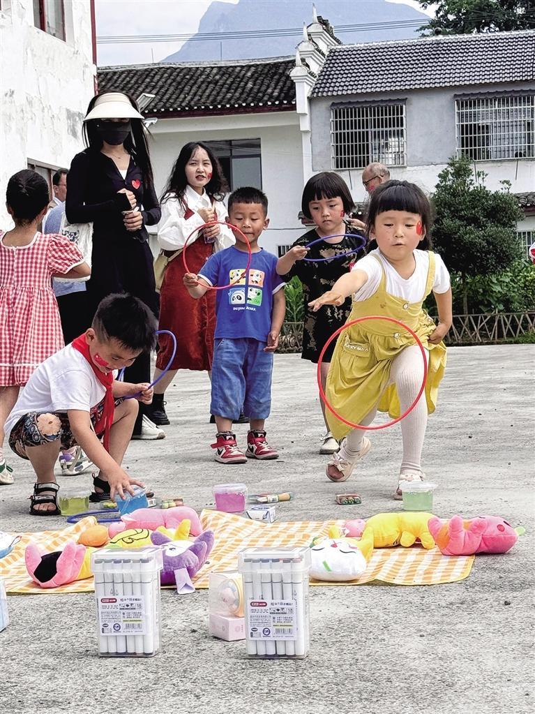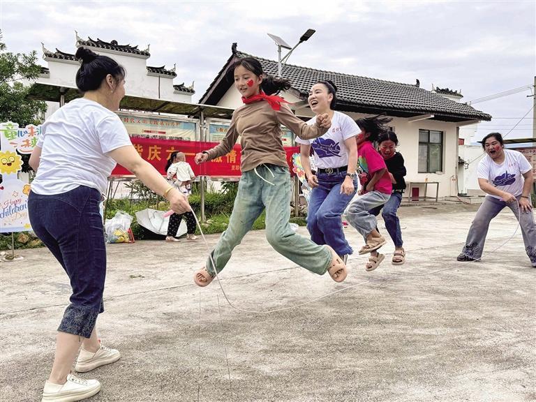 “花山臺姐姐”愛心團隊成員和孩子們一起玩跳繩。 團結報全媒體記者 楊賢清 攝
