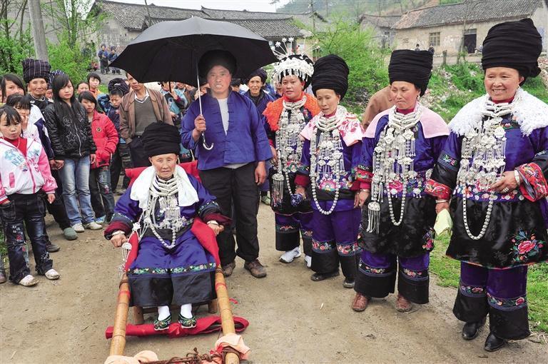 “交牲”完成,苗法師開始請龍。這時,東家主婦身穿艷麗的接龍衣裙,頭戴接龍帽登車上轎。所謂“上轎”,就是用兩根竹竿加一張靠椅綁成的滑竿,讓龍娘(東家主婦)坐在滑竿上,由兩人抬起,在苗族“巴代雄”帶領下,去寨子邊的水井處接龍神和接雷神。苗語叫“仲戎” 和“仲送”。接龍隊伍出門時,屋內忌吹嗩吶和敲鑼鼓,行人忌高聲喧嘩。