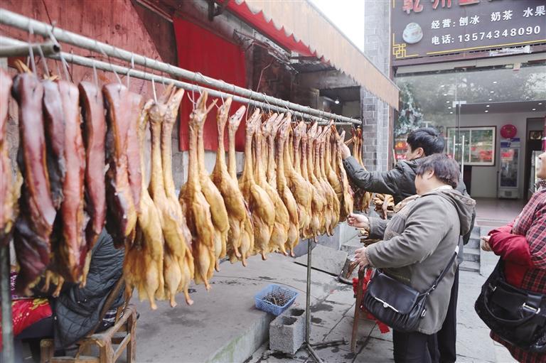 除了酸辣,乾州古城的板鴨也是吉首美食一絕。據(jù)說乾州板鴨的制作技術(shù)已有300多年,與吉首河溪鎮(zhèn)貢醋的歷史差不多。“鴨要肥,喂稻谷,炒鹽腌,焐得足,大料實,風(fēng)得干,皮金黃,肉紅爽,骨頭酥”,這是對制作乾州板鴨原材料的特別要求,唯此才能制作出油光發(fā)亮、肉質(zhì)細(xì)嫩、馥郁撲鼻、美味絕佳的正宗乾州板鴨。當(dāng)然,有了這些原材料還不夠,還得配上二水繞洲、三陸橫陳、狀如乾卦、地理位置得天獨厚的乾州古城,沒有了這塊風(fēng)水寶地,自然也就無處可產(chǎn)如此美味的乾州板鴨了。
