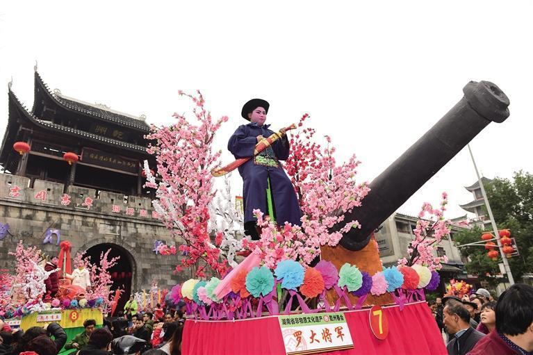 乾州春會淵源于古代民間宗教祭祀活動,以后逐漸成為慶祝節(jié)日的一種裝飾藝術(shù)。每逢節(jié)日或喜慶之際,這些色澤艷麗、造型拙樸、寓意明快的各類紙扎品,既為迎春祈福活動增添了幾分喜慶歡快色彩,又能讓人們從中會意到吉首人的生產(chǎn)、生活縮影和精神文化追求,是湘西神秘文化鮮活生動的構(gòu)成因子。