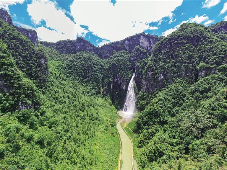 氣勢恢宏的大龍洞瀑布砸在水面上,升騰起的水霧在陽光的照射下,形成一道絢麗的彩虹。