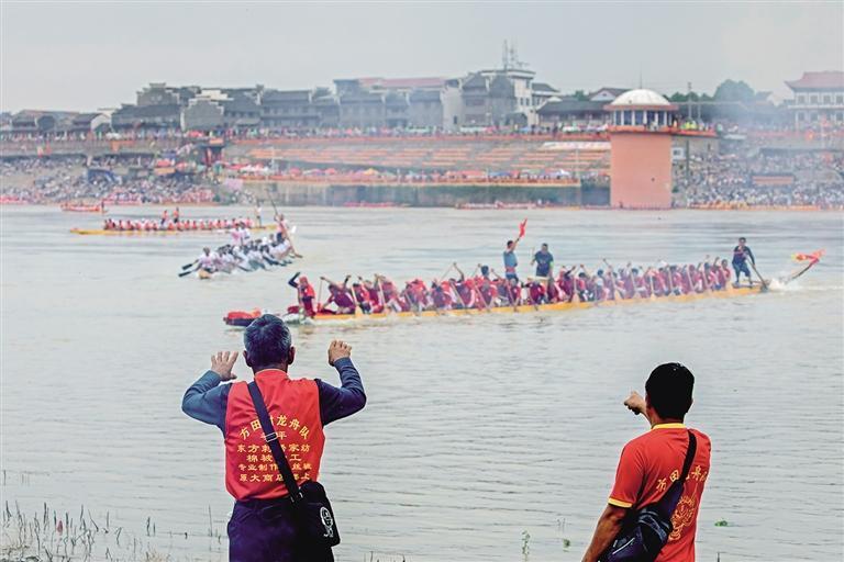 這天,浦溪村的龍舟在代朝山真武殿祭祀完,在村口辦完龍舟“跑火”儀式之后,在一片“喲嗬”聲中和鞭炮聲中下水了。岸上站滿了男女老少,龍舟在一片熱烈的歡笑里,蛟龍一般劈波斬浪地遠去。