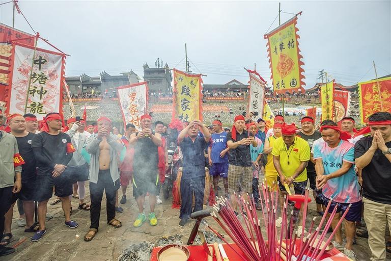 龍舟在下水之前,各個村的龍舟隊都會舉行祭祀儀式,希望通過祭祀給自己船隊和村子獲得一個好兆頭。橈手頭戴儺神面具,手持火把繞船驅邪,祈禱年年風調雨順、五谷豐登。