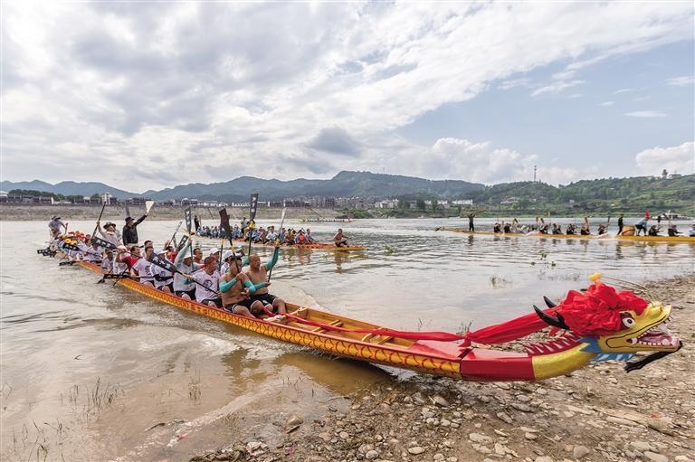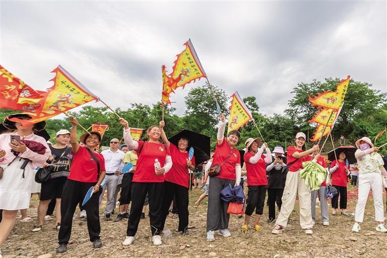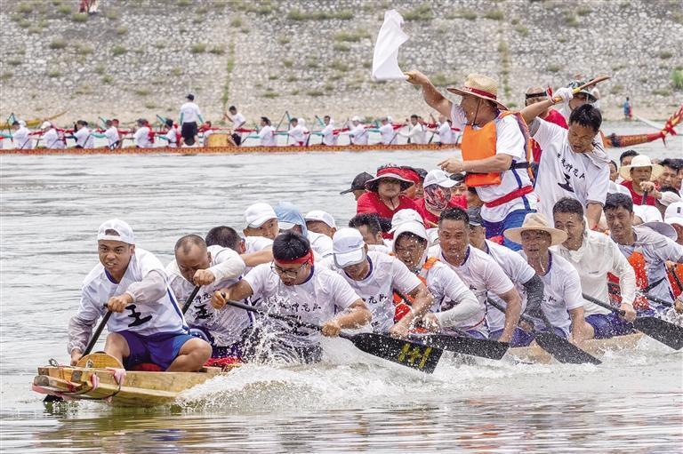 旗手站上龍船,大聲喊道:“一扒國泰民安,二扒風調雨順,三扒旗開得勝,四扒家族興旺發達!”而后,鑼鼓雷鳴,龍舟劈波斬浪,奮力前行。五彩繽紛的“龍旗”逐浪飛舞,站滿江堤的觀眾熱情高漲,人們在此起彼伏的鞭炮和禮炮聲中,龍舟你追我趕的緊張氣氛里,盡享著一年一度的激情與快樂。