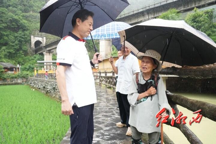 虢正貴在古丈夯吾苗寨督察防汛安全工作,并與當(dāng)?shù)卮迕窠徽劻私馍钌a(chǎn)情況。