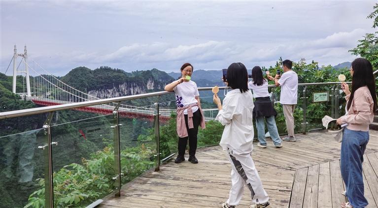 游客拿著矮寨大橋文創雪糕,與矮寨大橋合影。