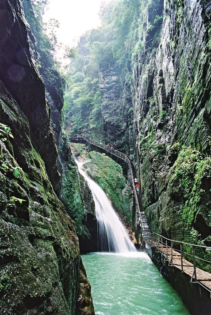 移步換景,繼續縱深,兩邊的崖壁越來越高,兩壁之間的距離越來越窄,最窄之處不到3米,這便是天龍峽的“一線天”了。