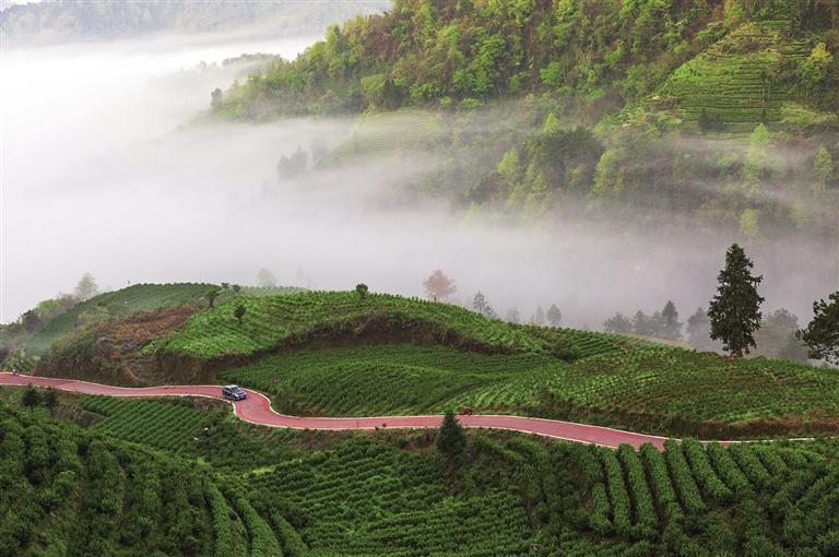 保靖縣呂洞山鎮(zhèn)黃金村至葫蘆鎮(zhèn)國(guó)茶村路段,茶園茶路交相輝映 。 胡孝東 攝