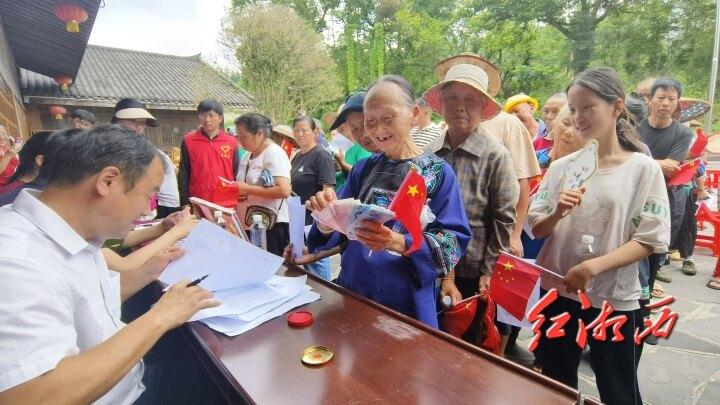 7月9日上午,花垣縣雙龍鎮(zhèn)十八洞村村部前坪,陽光明媚,熱烈的掌聲中,十八洞村村集體經(jīng)濟收益分紅儀式開始。