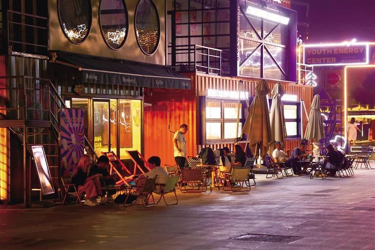 許多潮店入駐集裝箱店鋪,乾州歡樂城河邊的青年集市成為年輕人聚集的夜生活場所。 團結報見習記者 黃新媛 攝
