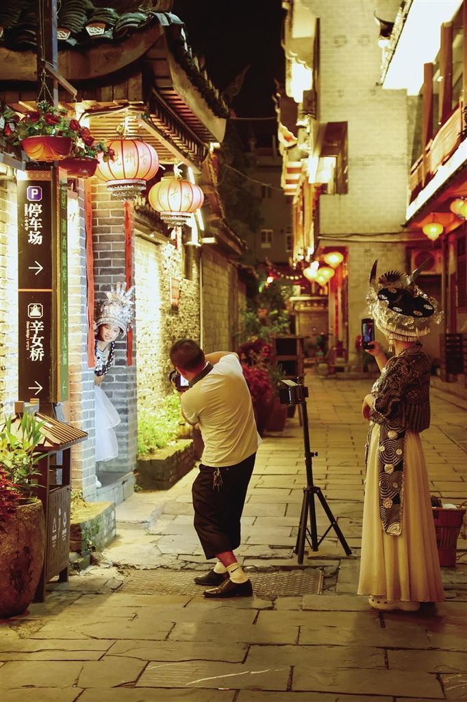 光是觀看還不夠過癮,古城里十幾家旅拍店夜晚生意更火爆。游客穿上精致的漢服、華麗的苗族服飾或影視劇同款戲服,在古韻悠長的街巷里留下倩影,既留下珍貴紀念,也成為古城里的風景。