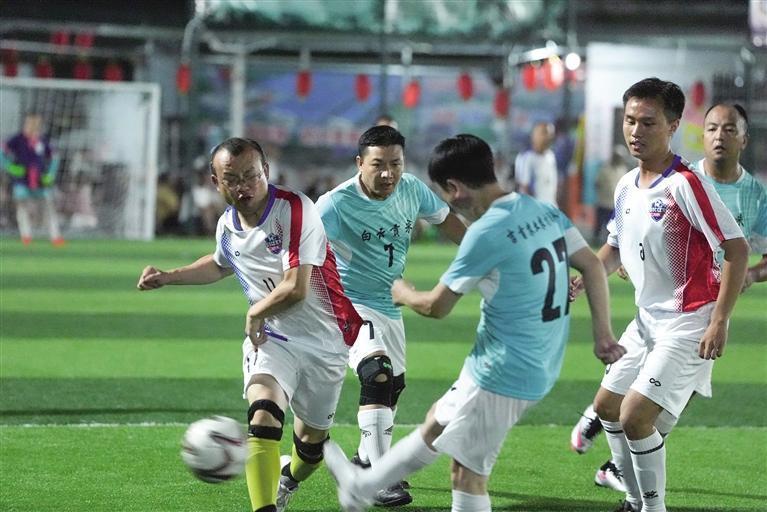 此時此刻,身穿熒光綠球服的市農(nóng)業(yè)農(nóng)村局白云貢米隊與身穿白色球服的乾州街道乾城似錦隊正在進行緊張的對決。跑位、帶球、進攻,搶斷、過人、射門……賽場氣氛緊張熱烈,局勢瞬息萬變,扣人心弦,引來觀眾陣陣喝彩。