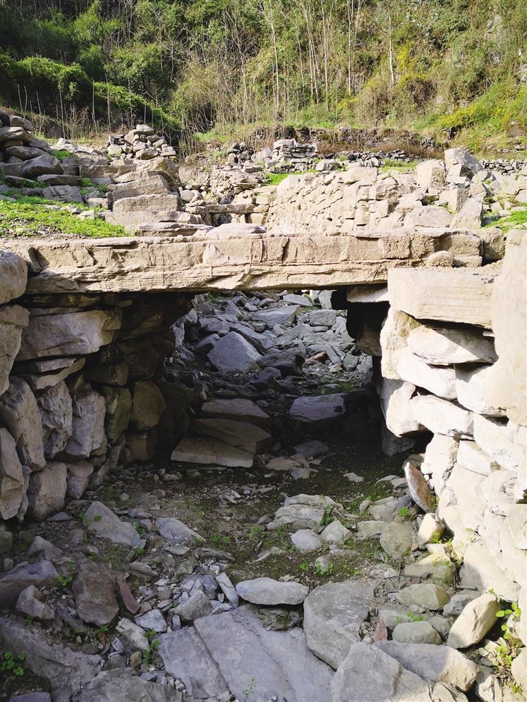 坐落在峽谷入口三里處的道布苗寨,曾經是騍馬峒古鹽道上最繁華的所在。“道布”是苗語音譯,翻譯成漢語即“坡腳之意”。以這里為起點,或直行深入峽谷走兩岔河,或沿左側上山走擒頭坡(今齊心苗寨),最后均在排云村匯合。從湖南往貴州的馬幫、商隊、挑夫,自乾州出發,到了道布苗寨都要打尖歇腳,吃飽喝足后,再行啟程。這個苗寨有四十來戶人家,隱藏在一爿山崖背后。鹽道從崖腳轉出,筆直穿過寨子。后山高崖上一股澗水瀉落下來,形成湍急山溪從寨子中間流過。溪澗兩邊的木屋由低到高,層層排列,左右有石板路沿溪上下。每隔數十米,即有一座小石橋連接對面。最下方第一座石橋處,東西向的鹽道與南北向的石板路形成十字交叉。客棧、酒家、飯館、商鋪,以及本地苗民售賣土產山貨的攤位,都集中在這十字街上,一派繁榮景象。民國后期,匪患猖獗,道布苗寨隔三差五遭到搶劫。加上公路興起,鹽道衰落,寨中居民紛紛遷離,村子最后被廢棄。如今只能從尚算完好的道路、橋梁、屋基、院壩等遺跡,遙遙想象道布苗寨曾經的興盛模樣。