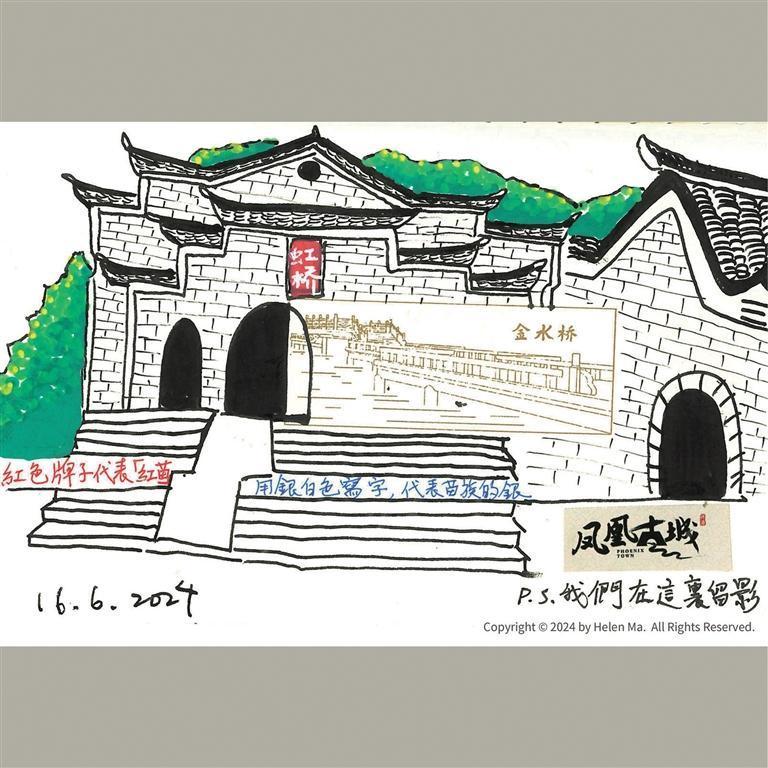 從手賬中可看到,短短幾天的行程中,馬凱君深深地感受到了鳳凰這座城市的文化魅力。鳳凰的地域文化特色、建筑設計都給她留下了深刻的印象。她在手賬中寫到,“ 如果荷蘭的cand houses(運河屋)讓我仿佛置身于童話世界之中,那么鳳凰古城中沱江河兩旁的新舊屋子,讓我置身于詩畫之中。”鳳凰的輪廓在馬凱君心中變得立體,每頁的畫配文字,滿滿都是鳳凰味道。
