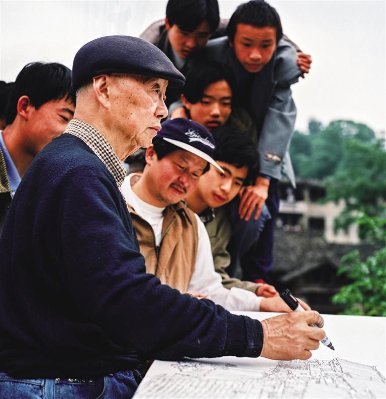 作為一代藝術宗師,黃永玉在繪畫、文學、泥塑、木刻等方面都有自己獨樹一幟的迷人特質,為世人稱道,對家鄉影響巨大。能近距離圍觀他的創作,是鳳凰后生難得的學習機會,先生傳道授業,樂此不疲。這是1997年他在鳳凰古城虹橋上寫生時現場教學場景。