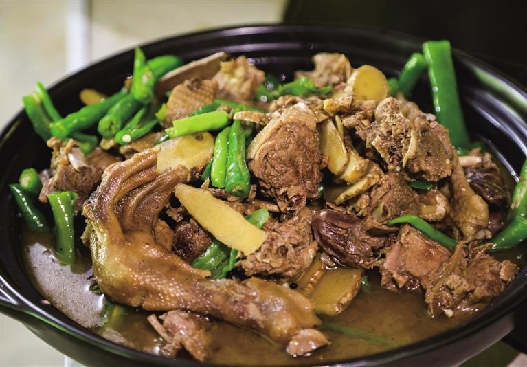 廚師把燉好的鵝盛進(jìn)砂鍋,旋即又炒了酸菜、空心菜等幾道小菜,一并端進(jìn)涼棚,一場酣暢淋漓的大餐即將開吃。