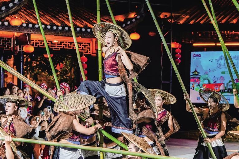 緊接著,《鼓舞湘西》《銅鈴接福》《闖灘號子》《赤膊溜》等民族舞蹈節(jié)目輪番上演,每一個節(jié)目都充滿了濃郁的民族特色和深厚的文化底蘊。舞者們用剛?cè)岵奈枳?,展現(xiàn)了土苗兒女生產(chǎn)生活的場景,表達了對生命的認知與情感。舞臺搭建在芙蓉鎮(zhèn)擺手堂,以天地為幕,以山水為景,結(jié)合絢麗奪目的舞臺藝術,使得整場表演極具觀賞性和互動感。