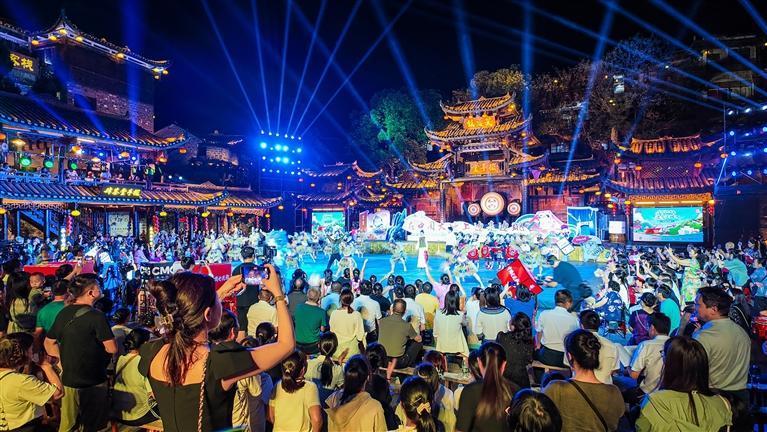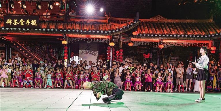 8月28日,晚上8時,芙蓉鎮(zhèn)沉浸在一片美麗燈火中,隨著《我在永順遇見你》的美好旋律響起,“在中國大地上邊走邊跳·湘西站”集中展演活動正式開啟。