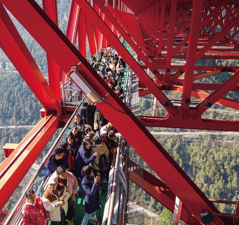 節假日,矮寨大橋下的觀光通道擠滿游客。