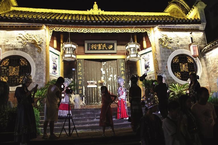 夜幕降臨,沱江兩岸,旅拍的燈光如點點繁星。