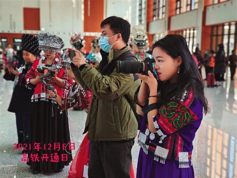 2021年12月6日,張吉懷高鐵正式通車,記者李明瀟(右一)在鳳凰古城站見證高鐵開進土家苗寨。