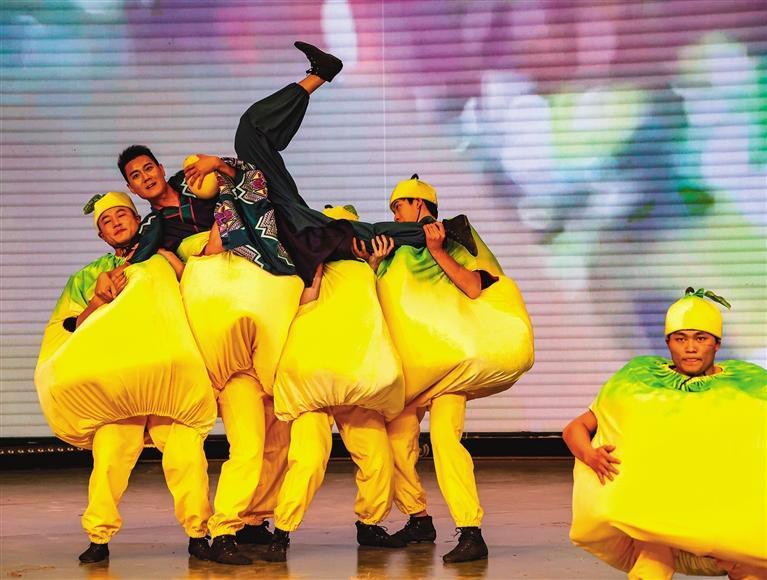《喜樂·豐收》用歡快的舞蹈動作,將湘西特色農(nóng)特產(chǎn)品帶上舞臺。 團結報見習記者 胡承鼎 攝