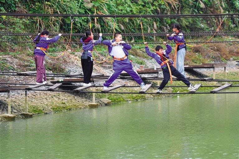 “飛奪瀘定橋,是紅軍長征中的一場重要戰斗……”在“飛奪瀘定橋”活動區,基地里的教官先為孩子們講述了紅軍長征的故事,接著指導大家扣上安全繩,一一登上“鐵索橋”,進行沉浸式體驗。