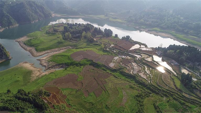 俯瞰南衛村一角,良田沃野,碧水充盈,草青樹綠,一幅田園風光畫卷。