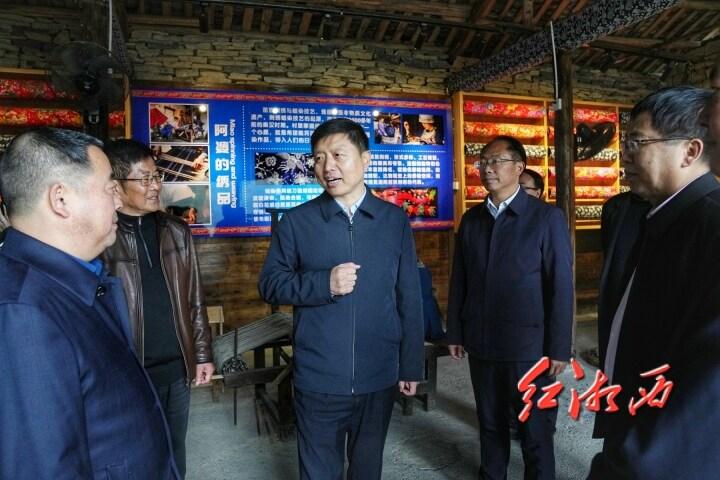 在麻沖鄉(xiāng)竹山苗寨景區(qū),劉濤走進苗繡堂、織布坊、豆腐坊等地,察看非遺保護傳承情況,參觀竹山花開演藝劇場、苗嶺無邊界泳池、竹山鄉(xiāng)居、神龍谷等景點,了解鄉(xiāng)村旅游發(fā)展情況。他說,要把傳統(tǒng)工藝融入現(xiàn)代設(shè)計,把民族元素融入現(xiàn)代元素,推動優(yōu)秀傳統(tǒng)文化創(chuàng)造性轉(zhuǎn)化、創(chuàng)新性發(fā)展。